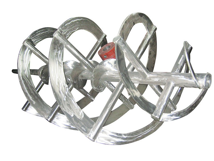 >低速型槳,循環(huán)優(yōu)良型槳,高粘度型槳,軸向流槳。物料沿著螺旋面上升或下降形成軸向的上下循環(huán)。一般是近罐壁上升,中軸匯合下壓。適用于高粘度介質(zhì)的傳熱、混合、溶解反應(yīng)等過程。此類攪拌器應(yīng)用于特高粘度介質(zhì)攪拌。桿螺帶(俗稱螺桿)是螺帶的特殊型式,直徑小沿軸引成螺帶與外螺帶配合應(yīng)用時(shí)方向相反可強(qiáng)化軸向循環(huán)。