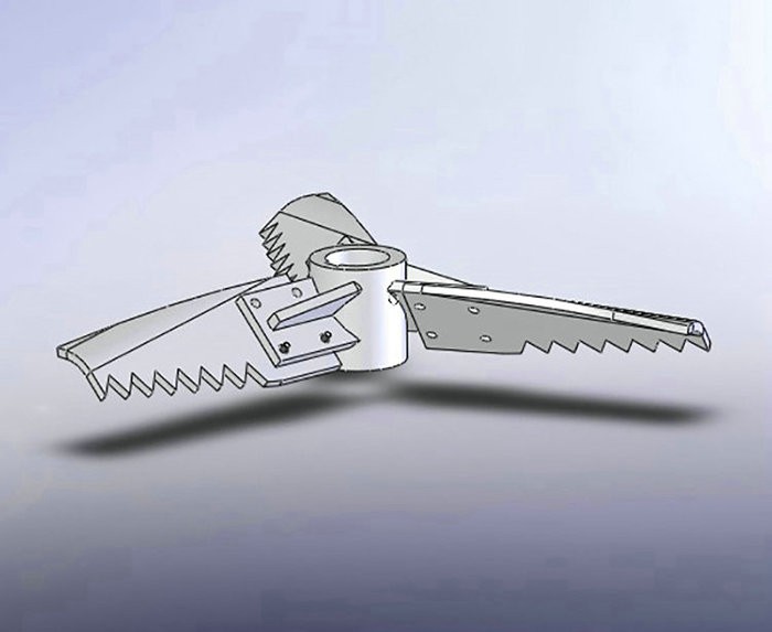 三葉、四葉槳在低速時(shí)運(yùn)用可視作槳式攪拌器。此類槳常配合罐擋板使用以減少旋渦,增加效果。此類槳常多層不同槳式組合使用以產(chǎn)生更復(fù)雜的流場(chǎng)。此類槳常在葉片下加穩(wěn)定環(huán)或穩(wěn)定片,以減少攪拌器在液體中的擺動(dòng)幅度。