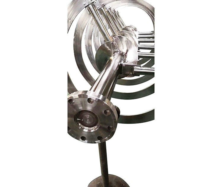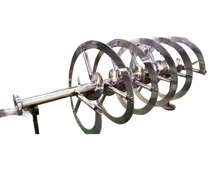 螺帶式攪拌器的葉片為螺帶狀,螺帶的數量為兩到三根,被安裝在攪拌器的螺桿上,螺帶式攪拌器的螺距決定了螺帶的外徑。